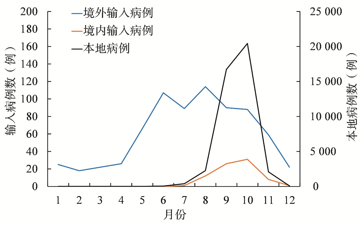 年份 | 本地病例(例) | 境内输入病例(例) | 境外输入病例(例) | 合计(例) | 发病率 (/10万) |