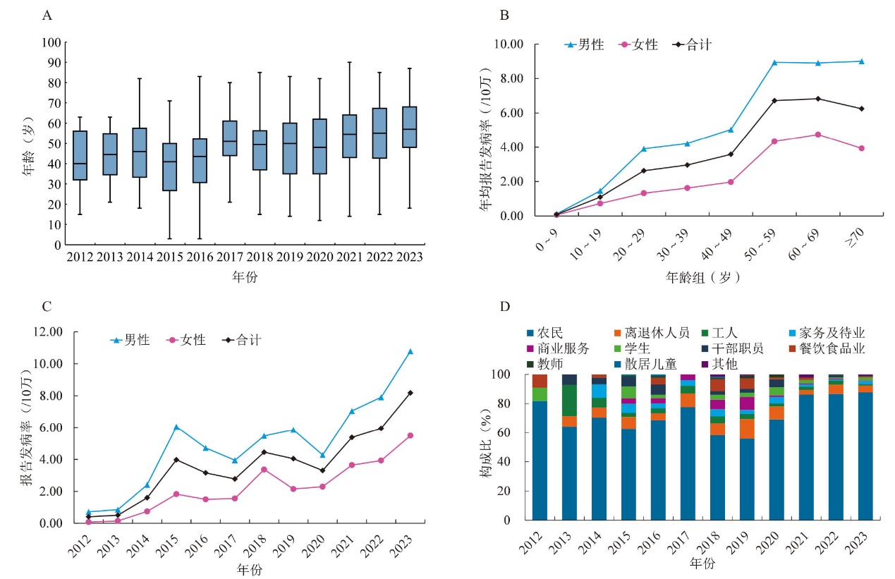 摘要: 目的 分析云南省楚雄彝族自治州(简称楚雄州)肾综合征出血热(hemorrhagic fever with renal syndrome, HFRS)流行特征及时空聚集性,为科学防控提供依据。方法 通过中国疾病预防控制信息系统获取2012—2023年楚雄州HFRS病例资料,从楚雄州疾病预防控制中心获取2021年宿主动物监测资料。对HFRS的三间分布特征及宿主动物监测结果进行描述性分析,对发病趋势进行Joinpoint回归分析,对病例的时空聚集特征使用空间信息可视化技术和核密度估计法进行评估。结果 2012—2023年楚雄州累计报告HFRS病例1 131例,死亡2例;年报告发病率为0.41/10万~8.18/10万,总体呈上升趋势(AAPC=34.37%,t=3.74,P<0.01)。3—7月报告病例数较多(583例,占51.55%)。病例主要分布在姚安县、楚雄市和禄丰市,共占总病例数的77.54%(877/1 131)。2012—2023年姚安县发病率持续上升(APC=AAPC=62.45%,t=13.26,P<0.01),楚雄市自2018年后呈下降趋势(APC=-25.30%,t=-2.42,P<0.05);时空热点区域分布呈现由楚雄市鹿城镇和东瓜镇向姚安县栋川镇及周边乡镇扩散的特征。男性年均发病率(4.88/10万)高于女性(2.16/10万),职业以农民为主(837例,占74.00%)。病例年龄中位数为50.0(38.0,61.0)岁,发病年龄由2012年的40.0(32.0,56.0)岁上升至2023年的57.0(48.0,68.0)岁。2021年平均鼠密度为3.01%,优势鼠种为褐家鼠(占64.00%)和黄胸鼠(占21.09%),鼠类汉坦病毒感染率为14.74%(158/1 072)。结论 楚雄州的HFRS发病存在明显的时空聚集性;男性、农民和50岁以上年龄段是主要发病人群,发病年龄有逐年上升趋势。应在高发季节做好宿主动物防制和重点人群防控工作。